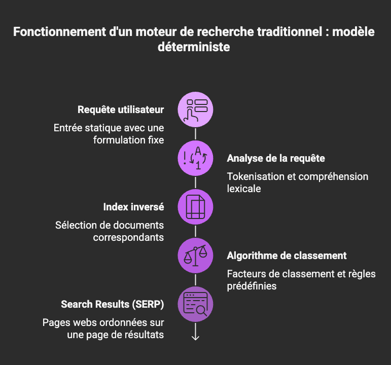 Les moteurs de recherche traditionnels fonctionnent principalement selon un modèle déterministe qui fonctionne comme suit (de manière simplifiée) :